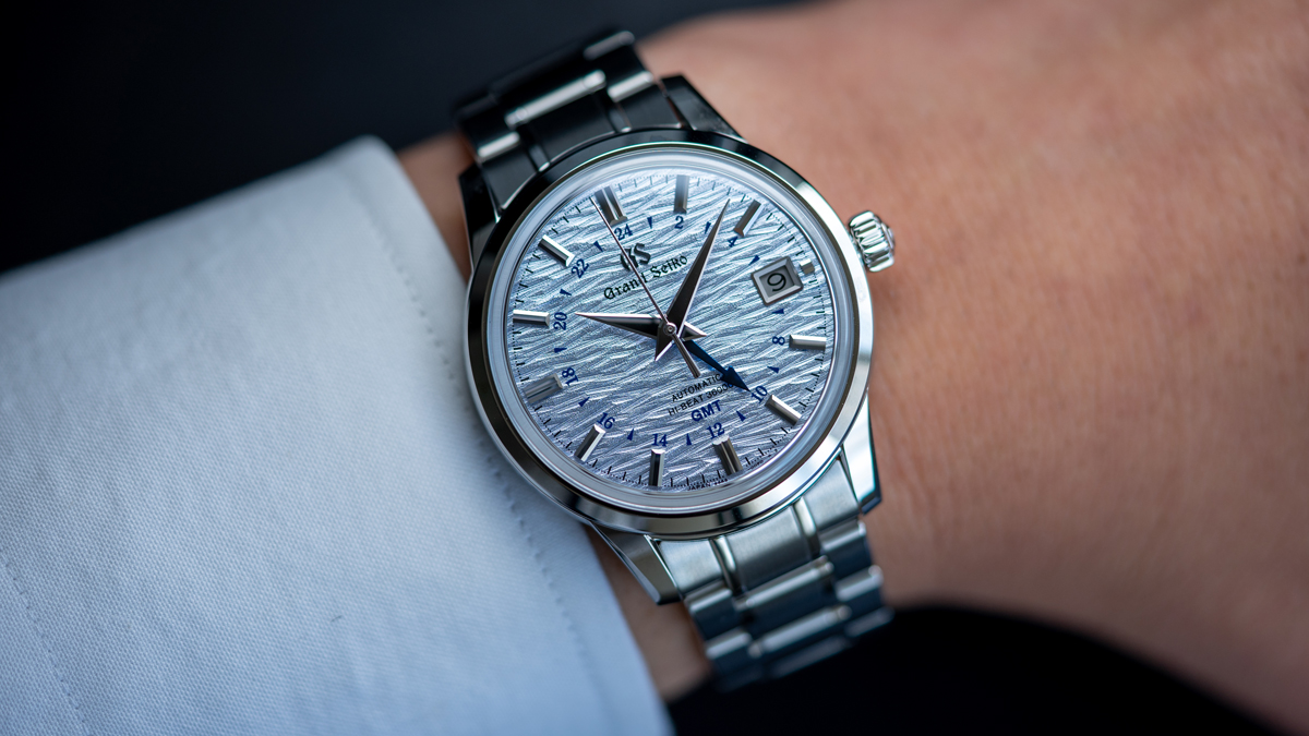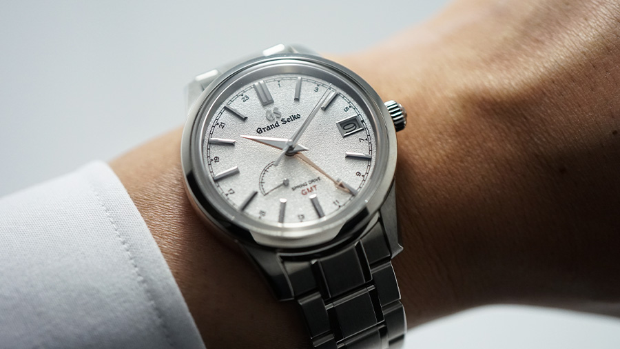 一年で最も昼が短く、雪深い冬の夕暮れ。雪の質感を表現した白い文字盤に、沈みゆく夕陽のようなピンクゴールド色のGMT針。しんと静まり返った雪国の静寂が聞こえてくるようです。