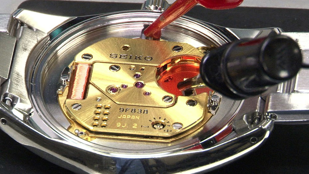 一般的にクオーツムーブメントは全自動ラインで製造されますが、9Fキャリバーは違います。機械式時計と同じように、熟練の職人が手作業で組み上げているのです。