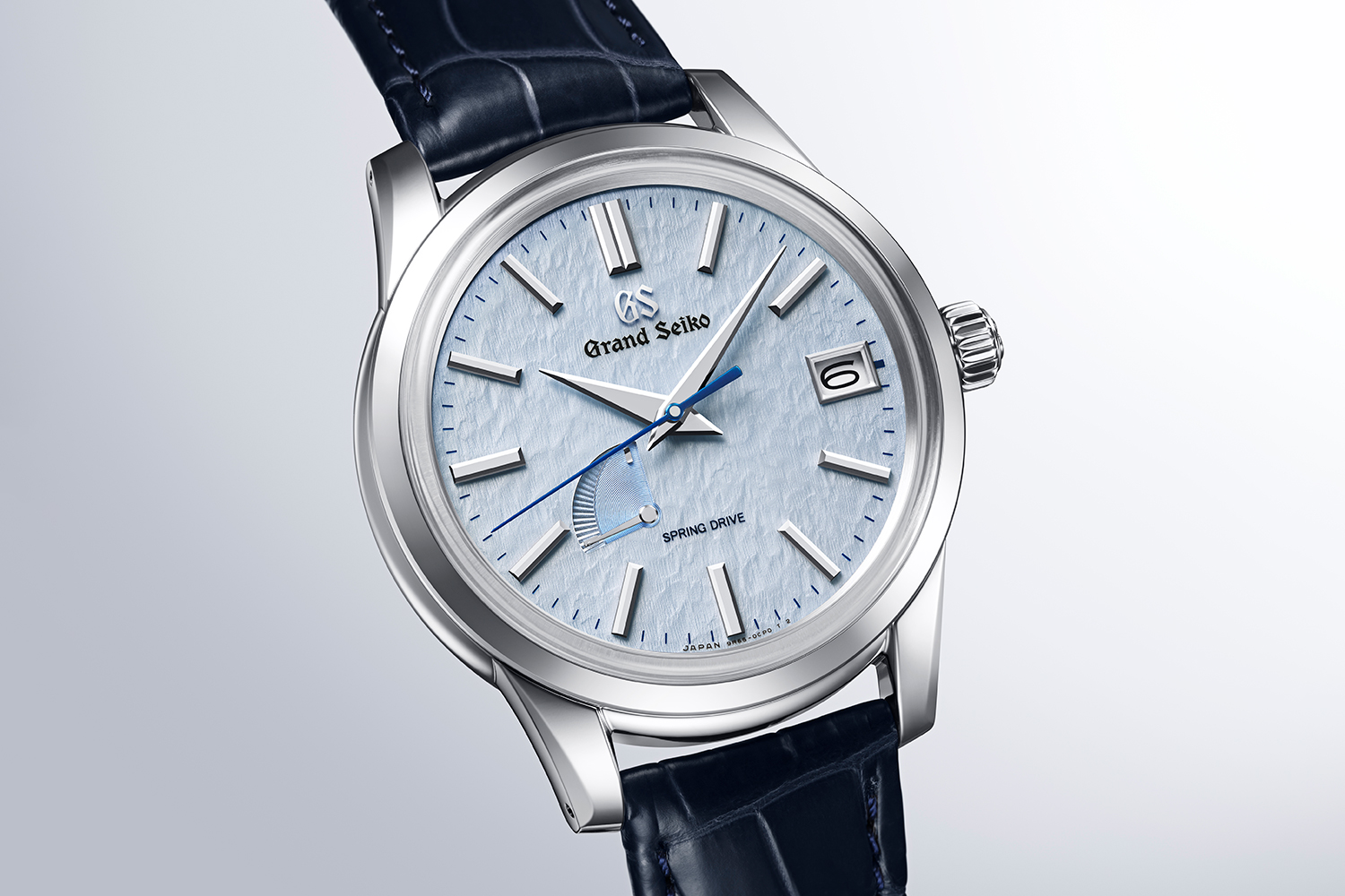 さらに、雪白パターンのダイヤルと、ダイヤルとレザーストラップに施されたブルーが時計にグランドセイコーらしい独創性を加えます。